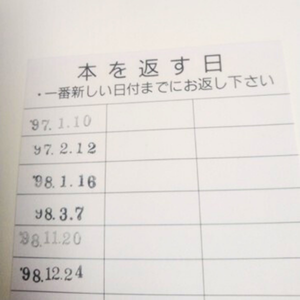 かつての図書館の本では当たり前だった、返却期日の日付のスタンプを押す紙が貼られてるのです。