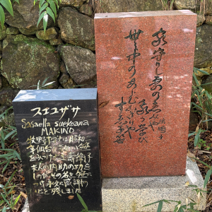 残念ながら、この「雑草という草は無い」の碑は有りませんが、つぎに有名だと思われる「草を褥に木の根を枕 花と恋して九十年」という都々逸は園内に石碑として建てられています。
