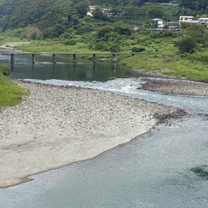 越知町の浅尾地区と鎌井田地区を結ぶ全長約121メートルの沈下橋で、山々に囲まれた立地と、対岸にある鎌井田集落と橋とのコントラストが美しく、アニメーション映画「竜とそばかすの姫」の中にも出て来る橋です。