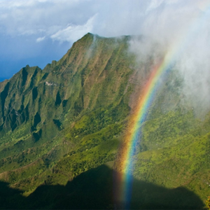 太陽が西に傾くころ、山の向こうから真珠湾へと大きな虹がかかった。それは、働き者で歌やダンスが大好きな小人の職人、メネフネたちがこしらえてくれた虹だ。彼らは、人間に雨や水、森の大切さを伝えるために虹を作る。赤は王族の象徴カヒリの羽、オレンジはイリマの花、黄色はよく熟れたバナナ、緑は谷のシダの葉、青は深い海の水、紫は女王のドレスの端切れ──それらを混ぜ合わせ、雫を作る。空が青くからっぽになったら、その雫を弓矢につけて天へ放つ。