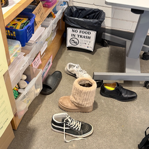 このクラスでは、クレヨンや色鉛筆を借りるとき、その棚の前に靴を片方だけ脱いでおく。