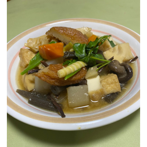 春に採取し塩蔵しておいたフキ、ワラビ、ゼンマイ、ウドなどの山菜を塩抜きし、大根、ニンジン、ゴボウ、タケノコ、ジダ豆、角こんにゃく、厚揚げなどとともに、味噌仕立てで煮込んだ、栄養満点の料理です。