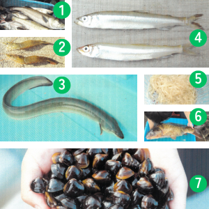 宍道湖七珍とは、スズキ・モロゲエビ(ヨシエビ)・ウナギ・アマサギ(ワカサギ)・シラウオ・コイ・シジミのことを言います。