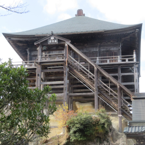観音堂は長元元年(1028年)、後一条天皇の勅願により建立された。そして、その建築様式は、日本唯一の「四方懸造」で、昭和25年(1950年)に「国指定重要文化財」に指定された。懸崖造りといえば、京都清水寺の清水の舞台が有名であるが、この観音堂は大きな岩の上に建てられ四方とも懸崖造りとなっている。