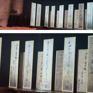ミュージカル「ISSA in Paris」の舞台セット(中央の短冊は一茶自筆「露の世ハ」)2026.1.10、日生劇場にて、筆者撮影(梅田芸術劇場許可済)